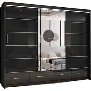 MN Furniture Sycylia High Gloss Sliding Door Wardrobe with Mirror, LED Light & Bottom Drawers | Available in 150cm, 208cm, 255cm