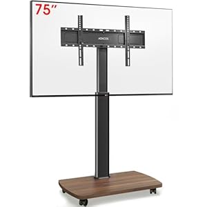 AOKCOS TV Floor Stand Rollable with Wooden Shelf, TV Stand with Wheels for 43-75 Inch, Height Adjustable Swivelling TV Stand, Max. VESA 600 x 400 mm