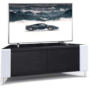 MDA Designs CORVUS Corner-Friendly Gloss Black Contemporary Cabinet Black BeamThru Glass Doors Suitable for Flat Screen TVs upto 50”