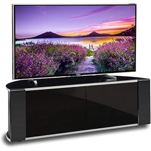 MDA Designs Sirius 1200 Remote Friendly Beam Thru Glass Door Gloss Piano Black Profile & Silver Trim up to 55″ LCD/Plasma/LED Cabinet TV Stand