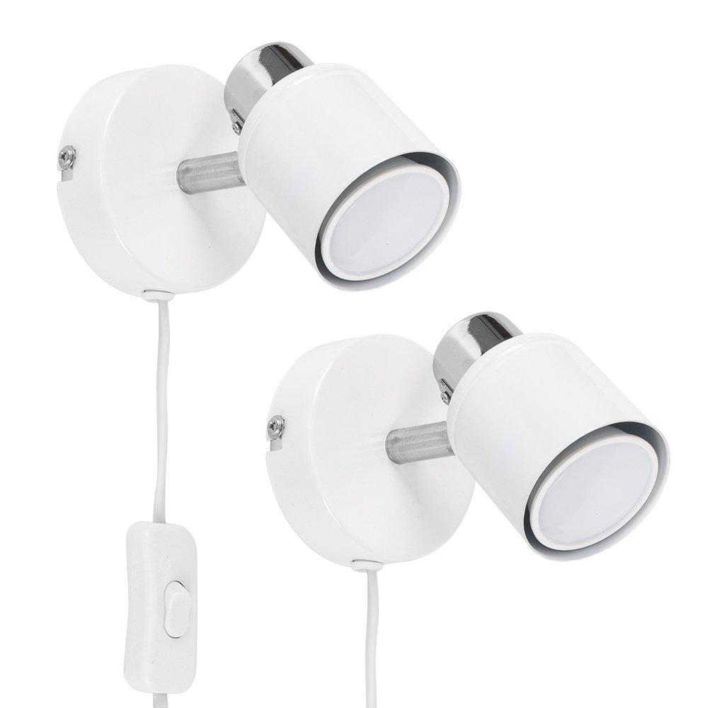 Pair of Single White And Chrome Adjustable Wall Spotlights With Cable, Plug and Switch – Ideal For Bedside Reading
