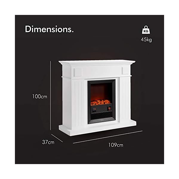 DIMENSIONS – 100cm (H) x 109cm (L) x 37cm (D). Weight: 45KG. Includes safety thermal cut-off device, protecting your fireplace in the event of overheating. This product is only suitable for well insulated spaces or occasional use. Manufacturer 2 Year Warranty Included